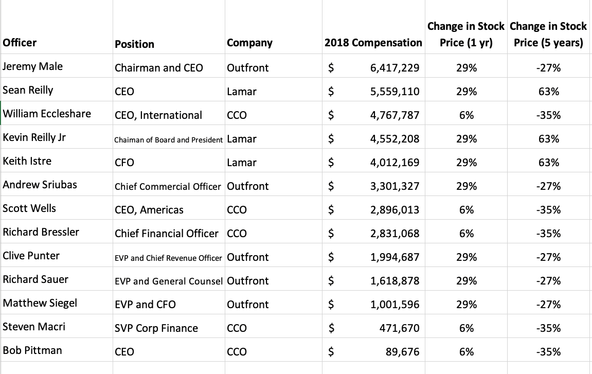 Executive Salaries at Lamar, Outfront and Clear Channel Outdoor