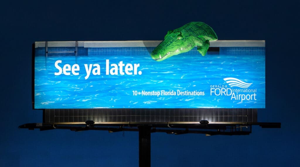 Through a collaboration with OUTFRONT Grand Rapids and SoftSigns3D, the inflatable, illuminated reptile encourages viewers to book their spring break travel plans with the West Michigan airport.