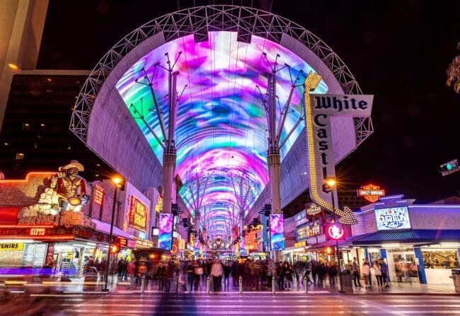 The Fremont Street Experience canopy is the largest single video screen in the world, with more than 130,000 sq. ft. of digital signage. Adjacent to 10 casinos and more than 60 restaurants, the digital canopy is 1,500 feet long and is suspended 90 feet above a pedestrian mall. A light and audio show by Viva Vision can be viewed day and night, and a zip line operates the length of the canopy.