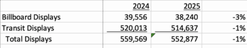 OUTFRONT’S total displays declined by 1% from 558,569 on 2024 to 552,877 in 2025 due to the loss of the company’s MTA and LA billboard contracts.