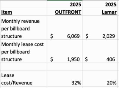 OUTFRONT’S billboards are mostly in urban areas. 75% of OUTFRONT billboard structures are non-conforming which is no surprise as most urban cities have a restrictive zoning code. OUTFRONT’S monthly revenue per billboard structure is 3 times higher than Lamar but OUTFRONT’S lease costs per structure are 5 times higher than Lamar. OUTFRONT’S plant is in big cities with higher traffic counts and more sophisticated landlords.