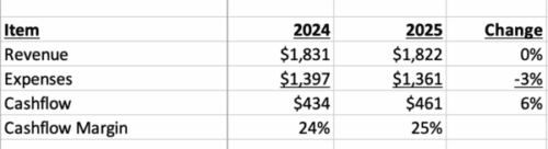 OUTFRONT has increased cashflow by 6% during 2026 by shedding employees and low margin billboard contracts. The cashflow margin (EBITDA/Revenue) from 24% in 2024 to 25% in 2025. We have calculated cashflow as EBITDA in order to capture all corporate expenses and overhead.