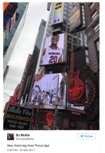 The billboards were on the NASDAQ and Thomson Reuters Buildings. South Carolina had a terrific weekend beating both Baylor and Florida to earn the right to play the Gonzaga Bulldogs on Saturday.