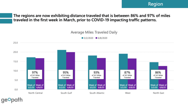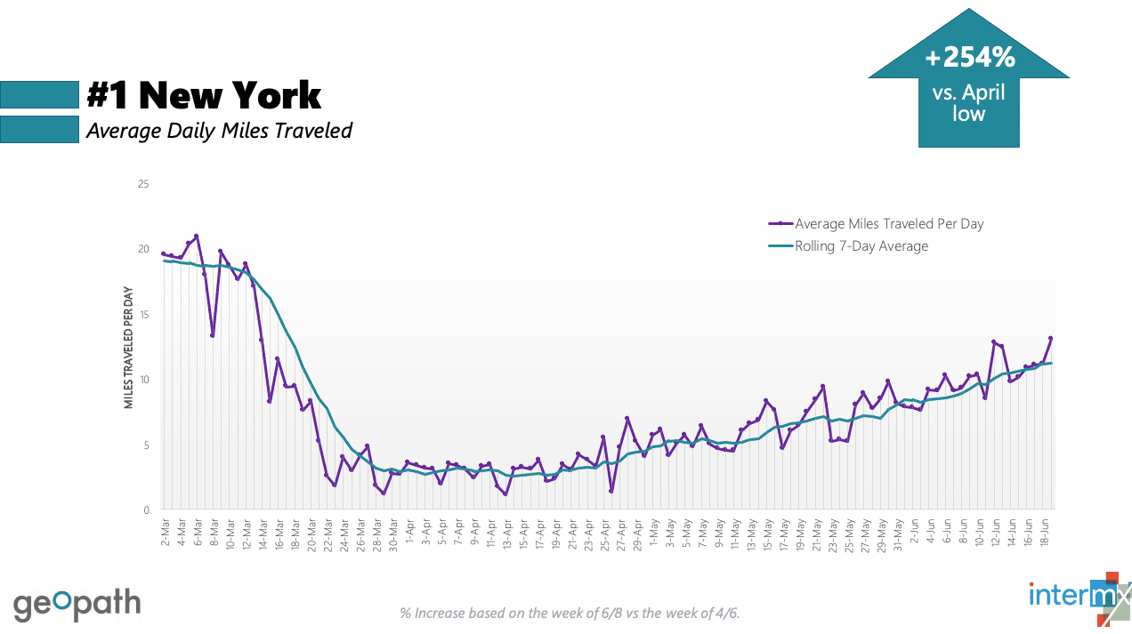Daily miles traveled are 86-97% of normal with the highest rebound from covid in the North Central regions and the lowest rebound in the Northeast according to Geopath’s COVID 19 Regional and DMA Analysis dated June 22, 2020. Download the 107 page report and you can see trends for your DMA. Here’s what the daily miles travelled data looks like for New York, the #1 DMA