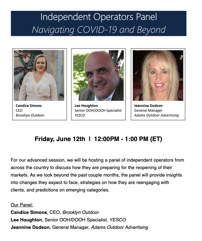 Geopath is sponsoring an independent out of home operators webinar Friday at noon easter time to discuss how to prepare for markets reopening.