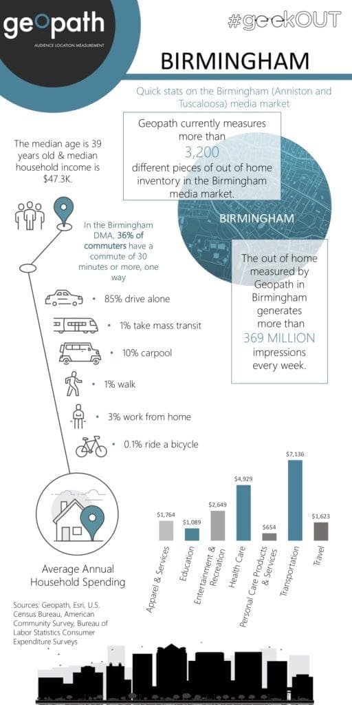 This week’s Geopath Market Spotlight focuses on the Birmingham DMA. Infographics for the top DMAs and much more are available to Geopath members in their geekOUT Library. For more information on how to become a Geopath member, you can visit: http://geopath.org/membership/.