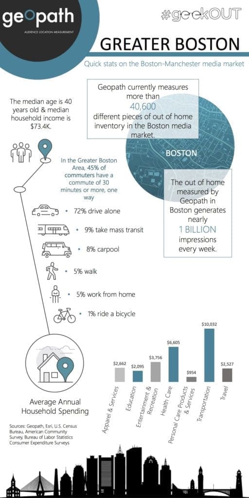 This week’s Geopath Market Spotlight focuses on the Boston DMA. Infographics for the top DMAs and much more are available to Geopath members in their geekOUT Library. For more information on how to become a Geopath member, you can visit: http://geopath.org/membership/.