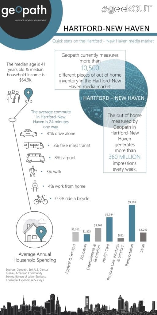 This week’s Geopath Market Spotlight focuses on the Hartford DMA. Infographics for the top DMAs and much more are available to Geopath members in their geekOUT Library. For more information on how to become a Geopath member, you can visit: http://geopath.org/membership/.