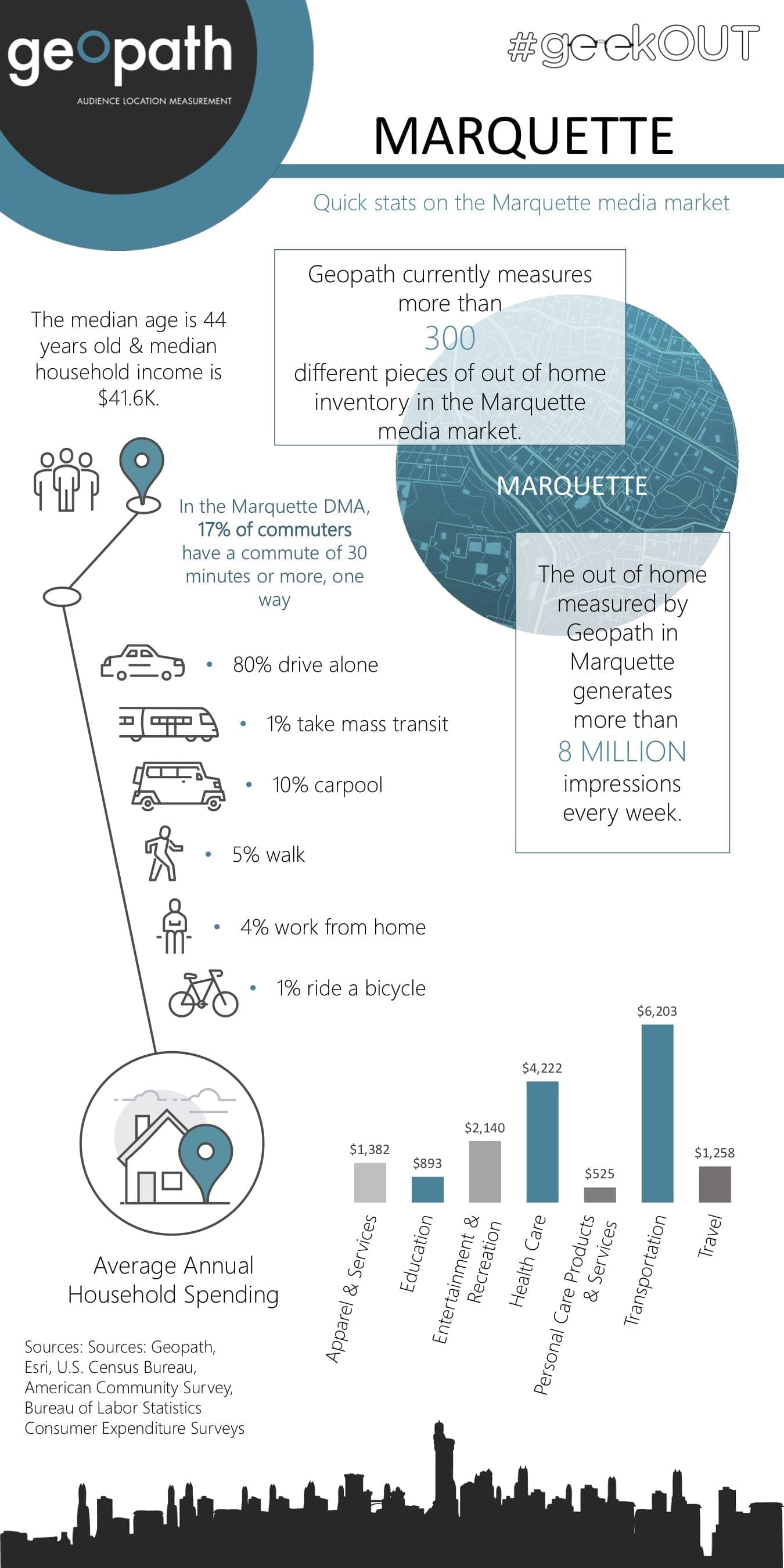 This week’s Geopath Market Spotlight focuses on the Marquette DMA. Infographics for the top DMAs and much more are available to Geopath members in their geekOUT Library. For more information on how to become a Geopath member, you can visit: http://geopath.org/membership/.