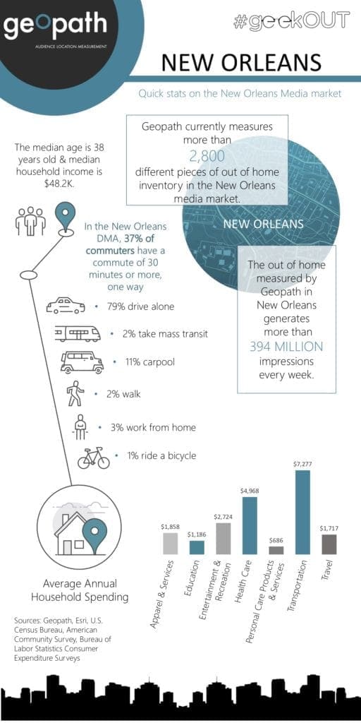 This week’s Geopath Market Spotlight focuses on the New Orleans DMA. Infographics for the top DMAs and much more are available to Geopath members in their geekOUT Library. For more information on how to become a Geopath member, you can visit: http://geopath.org/membership/.