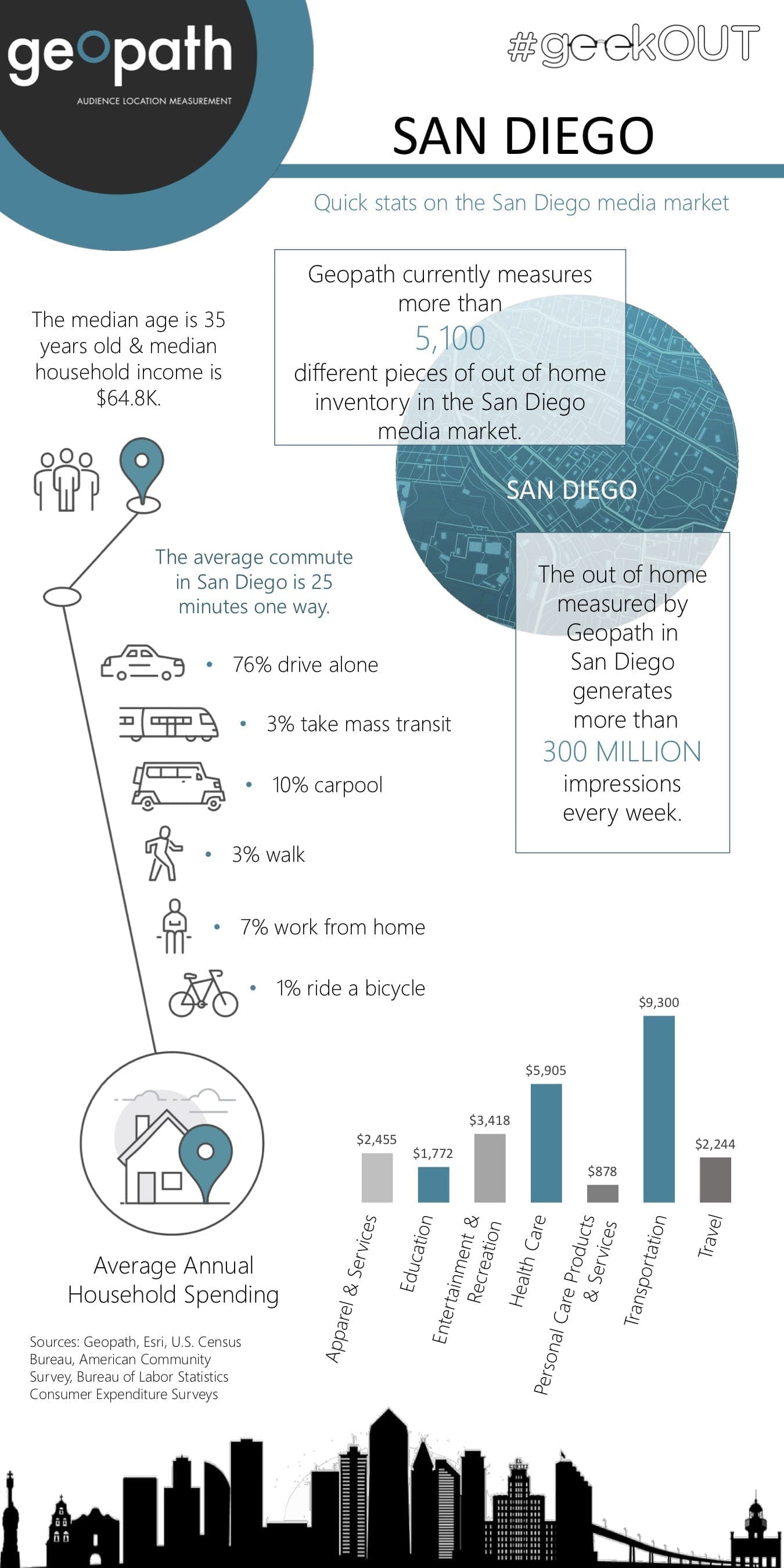 This week’s Geopath Market Spotlight focuses on the San Diego DMA. Infographics for the top DMAs and much more are available to Geopath members in their geekOUT Library. For more information on how to become a Geopath member, you can visit: http://geopath.org/membership/.
