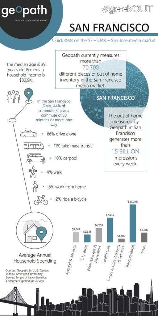 Geopath has assembled an amazing trove of data on the US out of home market that is available to all members in their geekOUT Library. Insider asked Geopath to share some facts on individual out of home DMA’s. Today Geopath analyzes San Francisco. Future posts will cover the top US DMA’s. A shout out to Kym Frank, Scott Fiaschetti and Brian Schopper for the info.