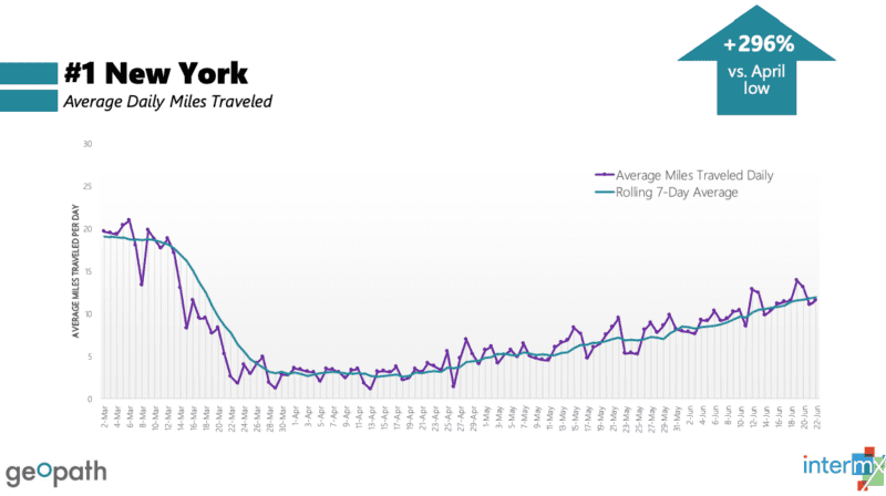 Geopath has released the average daily miles travelled report for the top 100 DMA’s dated 6/29/20. Download the report and send you clients the chart for your DMA. Here is the chart for the New York DMA.