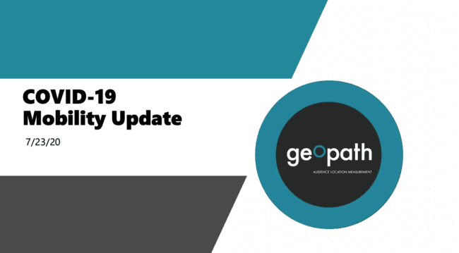 Geopath has updated the COVID-19 Mobility Update with data through the week beginning July 13, 2020. Daily miles travelled is now 95% of the travel occurring the first week of March prior to COVID-19 restrictions.