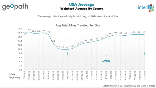 Geopath’s 8/6/20 Mobility update reports that traffic for the week of July 28-August 2 is 95% of normal. Here’s the US weighted average for daily miles travelled.