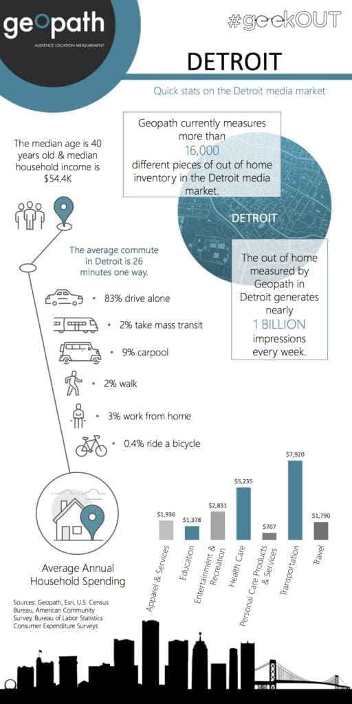 This week’s Geopath Market Spotlight focuses on the Detroit DMA. Infographics for the top DMAs and much more are available to Geopath members in their geekOUT Library. For more information on how to become a Geopath member, you can visit: http://geopath.org/membership/.