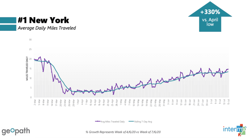 Geopath has updated the top 100 DMA average daily miles travelled report as of July 20, 2020. Make sure you’ve got your DMA handy in case clients ask. Here’s what New York looks like. Daily miles travelled continues to inch upwards.