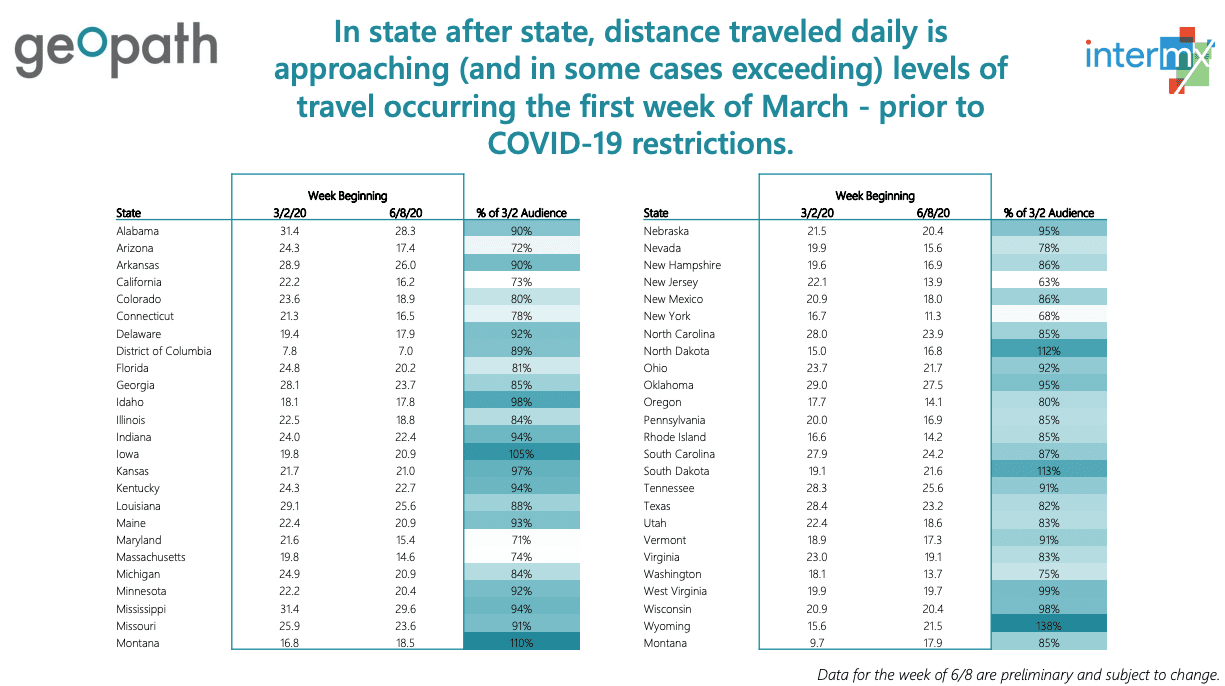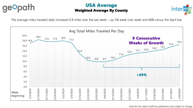 Average miles travelled increase by 0.8 miles during the week ended June 15, which marks the 9th consecutive week of growth.