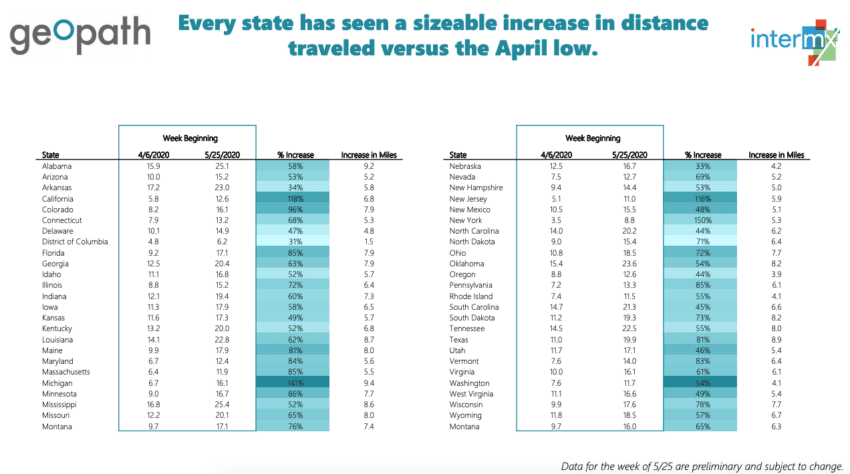 Average miles travelled per day increase for the 7th straight week according to the Geopath COVID-19 mobility update for June 5, 2020.  Average total miles travelled per day increased from 14 for the week beginning May 18 to 14.1 for the week beginning May 25.
