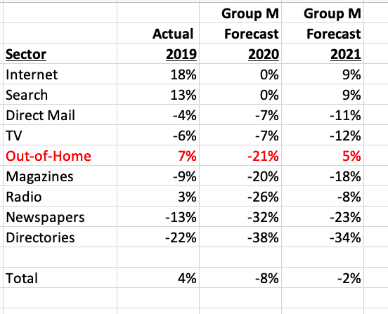 - Group M forecast’s out of home growth of 5% growth in 2021. This exceeds all media sectors except internet and search as out of home benefits from “the flexibility that follows from digitization, including programmatic trading tactics.”