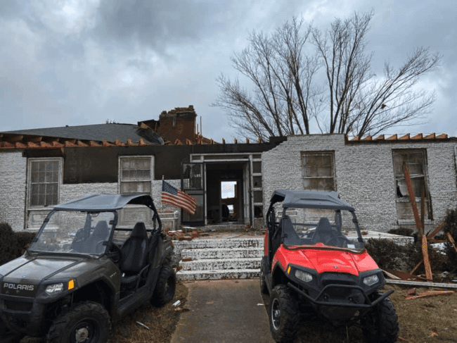 On the early morning of March 3, the tornado came that left a path of destruction for 52 MILES across Tennessee, from Nashville to Cookeville. The tail of the tornado, slammed into our girls home, ripping part of the roof off the house, and destroying a back living room wall. A French door on the back of the house was ripped off, flung through the air, and was impaled in the top of a tree in the FRONT yard of the property. Luckily all of the residents of the home remained safe, and were evacuated that night to a local church. As the new day dawned, workers began pouring in, removing all the contents of the home, salvaging everything not damaged by debris or water. In two days, teams cleared the home of all furniture, and the remains of the roof and damage wall was removed.