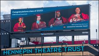 MINNEAPOLIS (June 12, 2020) — Hennepin Theatre Trust and Clear Channel Outdoor have partnered to celebrate and honor The FAIR School Downtown’s graduating class of 2020 by displaying messages of congratulations on the billboard atop 900 Hennepin in downtown’s Hennepin Theatre District. The messages will be on display throughout June.