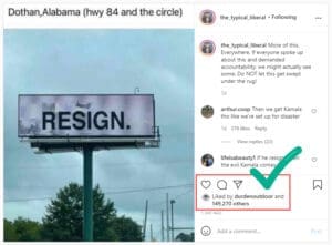 - That OOH is the linear bridge from our social media to traditional media without censorship. The example: The image shown is a screenshot of the_typical_liberal (2.4 million followers) Instagram post from yesterday around 10 am. Bill Durden’s billboard was screenshot and sent to Grant Godwin from a follower. Grant posted Durden’s Dothan Billboard on Hwy 84 with his Godwin’s comments – presently, ~150,000 people have liked the billboard. For every like, a ratio of 4 to 1 more views on Instagram – so the client estimates over 600,000 people have seen Durden’s billboard all over America and the globe. Moreover, in the comments section(~1000) eight other states have been mentioned as running the same RESIGN creative. That’s 9 states being validated in one guy’s post. The post starts a linear process of others influencers sharing the post on their social media which leads to mainstream media writing articles and maybe even bringing TV cameras. The client fully expects local articles to appear in the coming days regarding the various forms of creative as a result of this post.