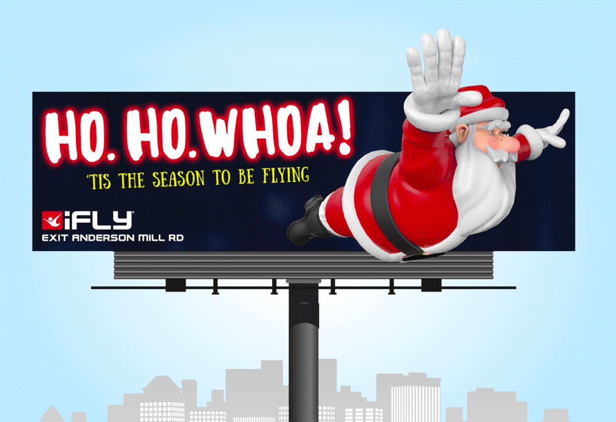 We work on all sorts of projects at Out of Home Creative from designing a single billboard location to outdoor advertising campaigns across multiple cities with a variety of different structures and platforms. Most of the time, clients provide little to no creative direction but in this case the client, iFly Indoor Skydiving had a previous holiday-themed advertisement, including a holiday-centered tag line, which they wanted to use as the starting point for their next campaign.