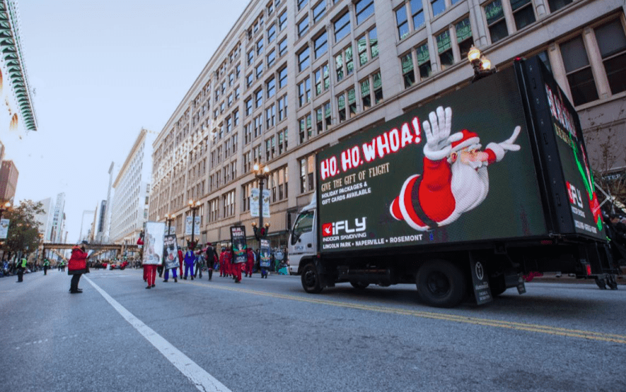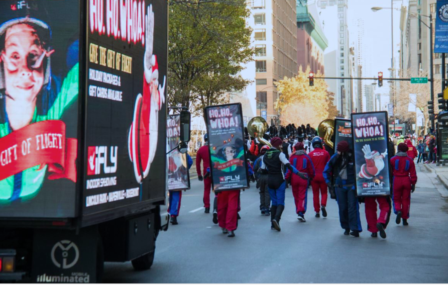 In Chicago, the advertisements were featured in the McDonald’s Thanksgiving Day Parade while rotating digital ads ran on Illuminated Mobile’s digital truck and two sided walking billboards. Team members carrying the walking billboards handed out iFly informational cards.