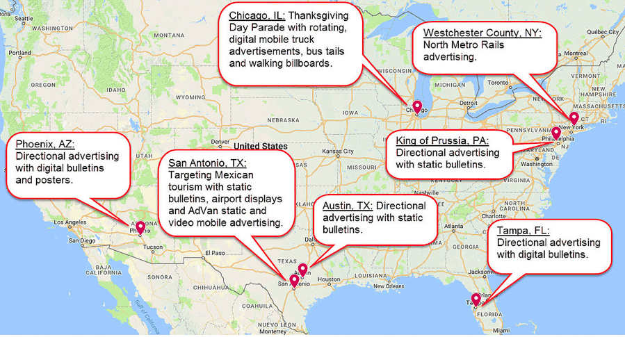 The following map outlines the target markets with the the outdoor advertising products used in each market as part of this 2017 holiday campaign.