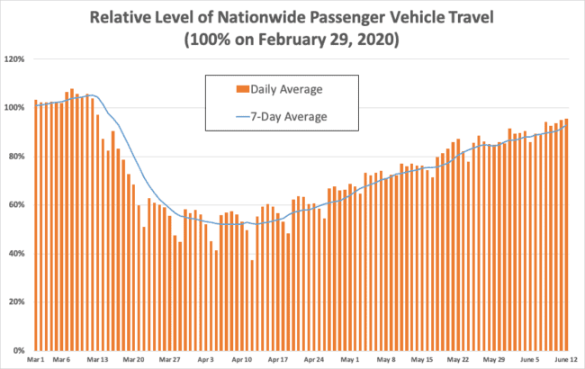 Personal travel has improved to 93% of normal according to the Inrix US National Traffic Volume Synopsis for June 6-12, 2020. Here are the key findings.