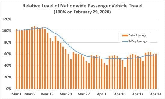 The Inrix US National Traffic Volume Synopsis shows traffic continues to rebound. Here are some of the highlights for the week ended April 24.
