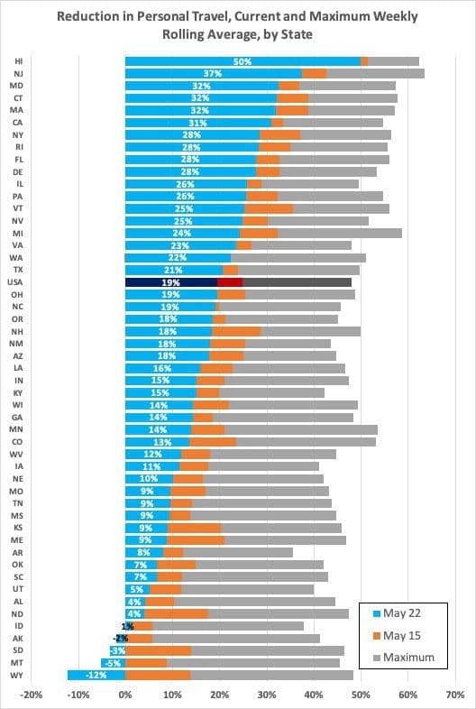- Personal travel increased in every state for the fifth week in a row. Four states (Wyoming, Montana, South Dakota and Alaska) and one metropolitan area (Mobile) actually had personal traffic which exceeded pre-covid levels.