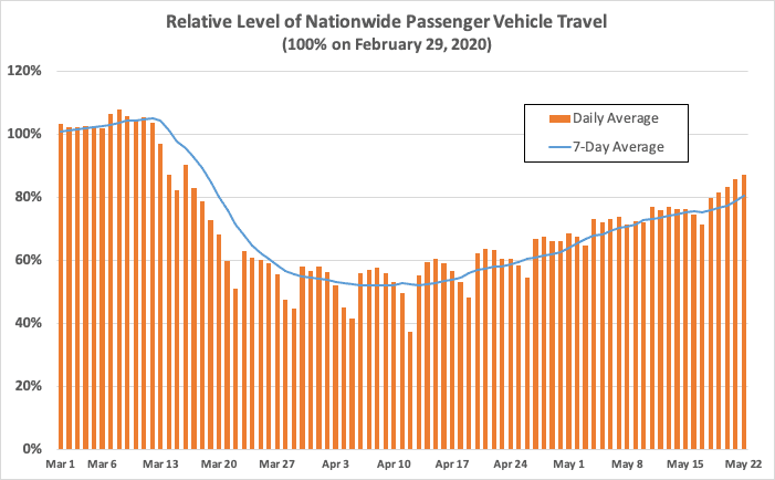 - Personal travel improved to 81% of normal for the week ended May 22, up form 75% of normal for the week ended May 15.