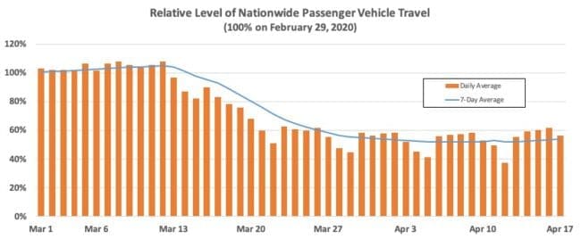 Inrix reports that national wide passenger travel for the week ended April 17 has stabilized at 54% of normal versus pre-covid 19 periods. Here’s the chart.