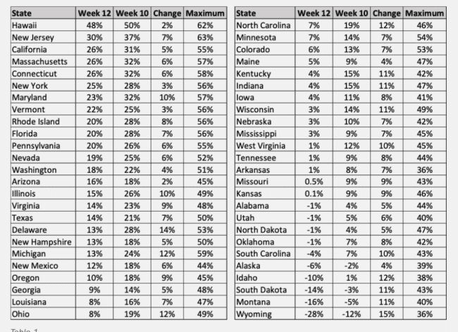- Ten States (Alabama, Alaska, Idaho, Montana, North Dakota, Oklahoma, South Carolina, South Dakota Utah Wyoming) now have travel which exceeds the control period before covid-related travel declines. You can find your state below.