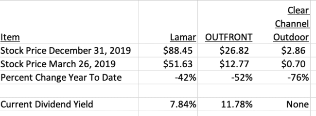 If you think that the coronavirus disruption is a temporary event and revenues will eventually return to 2019 levels then you should buy the US out of home companies because they are undervalued by 40-50%.