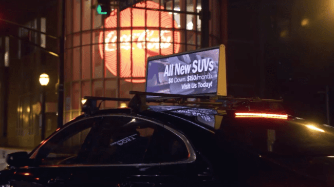 That’s exactly right. So it comes in two flavors. There’s some brands who just want to own the market. They want everyone in Atlanta to know about this new product or service. And so they’ll be doing a campaign where the billboards have one of the 8 ad plays or 2 of the 8 ad plays…and then a similar ad with video is playing on the Ubers. So when you’re in the passenger seat or you’re a pedestrian walking down the street you look up and there’s that 14 by 48 ad and you look at a side and there’s an Uber of the ad. It’s penetrating that mindshare that everyone is trying to get…Then there’s another cool thing that we’re doing….because we know where the vehicles are…we can also have brands say but you know what, I really only want to heavy up on those ads being shown on the billboards when there’s cars in proximity…