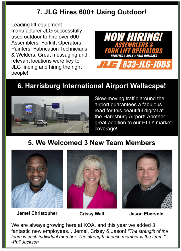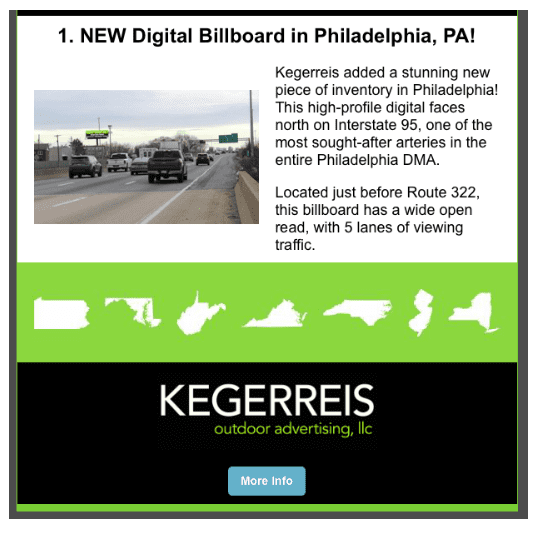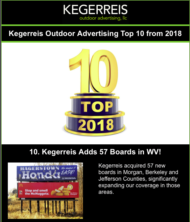 This email newsletter from Kegerreis Outdoor Advertising shows how to communicate with clients and prospects. It informs clients of a recent acquisition and personnel changes, talks about market trends and gives examples of successful out of home campaigns. Kudos to Eric Murr (VP Sales and Marketing), Christy Schale (Creative Director) and Jennifer Barnhart (Marketing Director) for showing us how to stay top of mind with customers and prospects.