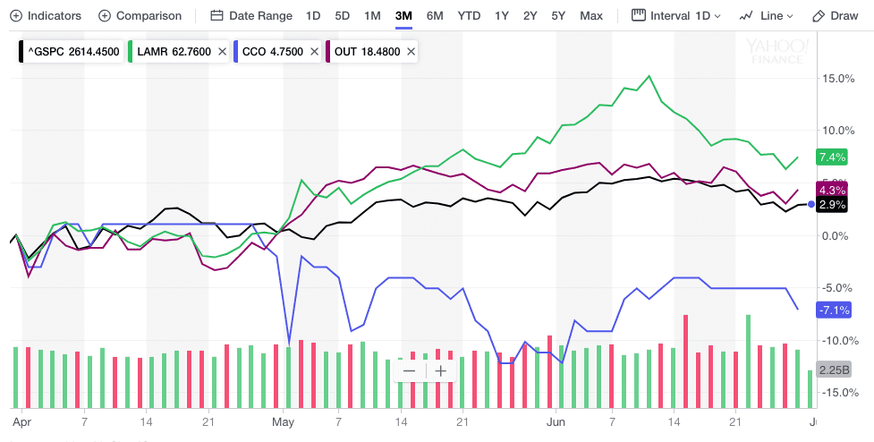 Stock Performance for 3 months ended June 2018. S&P 500 (black), Lamar (green), CCO (blue), OUTFRONT (purple)