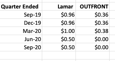 Lamar Advertising  will pay a cash dividend of $0.50/share on September 30, 2020.  The dividend equates to a 2.96% yield on the stock down from the 4-6% dividend yield Lamar was paying prior to Covid.  Lamar cut the dividend during Covid to conserve cash.  Lamar’s dividend is running at 50% of pre-Covid levels but at least it’s paying one.  OUTFRONT suspended dividends in June.  Clear Channel Outdoor hasn’t paid dividends since January 2018.  See chart below.