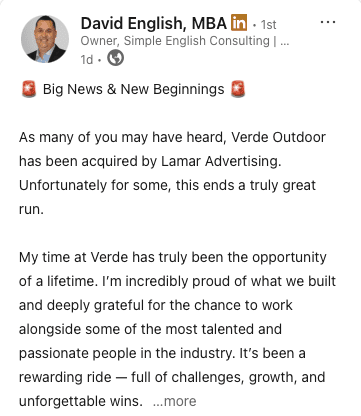 Two events have put out of home employees in play. First, Lamar bought Verde Outdoor and when Lamar buys a company it keeps ad contracts, the leases, a few sales reps and lets the other people go.