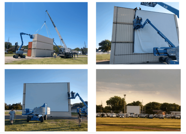 The drive-in movies returned to Kearney NE on June 18th when The World Theatre began “spinning the reels” and motion pictures lit up the big white screen. The World’s pop-up is utilizing stacked steel shipping containers with a white screen attached thanks to the help of Lind SignSpring and Camel City Posters. A Kearney couple donated a projector, and Dave Roseberry, manager of the Buffalo County Fairgrounds, agreed to allow movies to be shown in the fairgrounds’ parking lot.