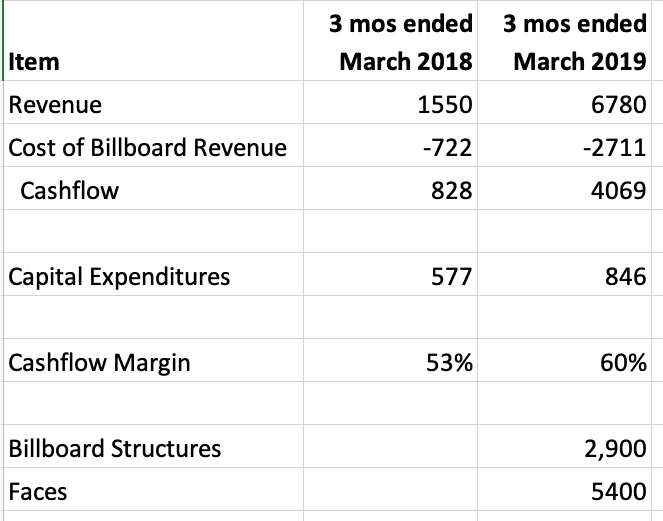 - Net billboard revenues increased 337% to $6.8 million during the first quarter of fiscal 2019 due to the acquisition of Waitt Outdoor, Key Outdoor and Tammy Lynn Outdoor in the latter half of 2018.