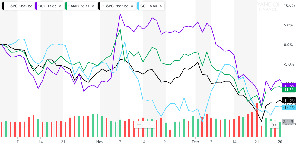 Stock market woes hurt US Out of home operators during the 4th quarter of 2018 although Outfront and Lamar outperformed a dismal market. 2018 was the worst year for the stock market since the 2008 financial crisis. On an annualized based the stock market was down 57% during the fourth quarter.