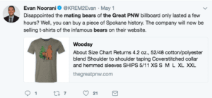 Spokane, WA based apparel company, The Great PNW, went viral with a short-lived but lively billboard campaign in this Insider’s home town. On April 30th commuters were met on their drive downtown with this image of two bears on a Lamar posted sign. It didn’t take long before Twitter was abuzz with the idea that the two bears were maybe a little too “friendly”. Joel Barbour, the Great PNW owner, told a local news station they had made the billboard to look like two bears mating, and that they thought it was funny.