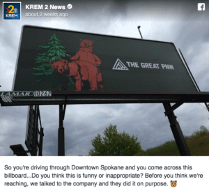 Spokane, WA based apparel company, The Great PNW, went viral with a short-lived but lively billboard campaign in this Insider’s home town. On April 30th commuters were met on their drive downtown with this image of two bears on a Lamar posted sign. It didn’t take long before Twitter was abuzz with the idea that the two bears were maybe a little too “friendly”. Joel Barbour, the Great PNW owner, told a local news station they had made the billboard to look like two bears mating, and that they thought it was funny.
