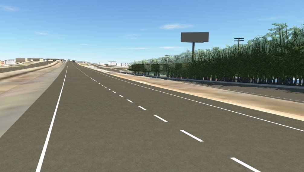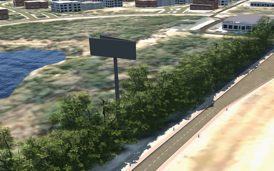 We’ve recently been working with one of our clients on creating virtual drive-through 3D models of proposed billboard installations. This technology allows for verification of sight lines and identification of visibility obstructions without having to mobilize a crane and flag to the field to represent a billboard structure. It also allows for the creation of a multitude of height and face size variations to determine which configuration would work best for visibility.
