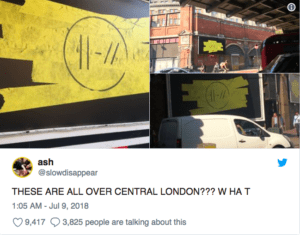 The most recent example comes from alternative hip-hop duo Twenty One Pilots (TØP). On July 9, a year after the band went publicly silent, fans around the world woke to find mysterious billboards in major international markets such as Berlin, London, and Toronto featuring the band’s new logo. TØP had also applied the new look across social media accounts.