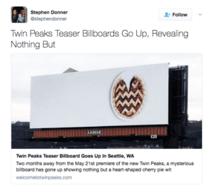 The remake of Twin Peaks is coming soon to Showtime and the promotional campaign is in full swing. The newsletter Bloody Disgusting reports that billboards have been reported in Washington, Pennsylvania and Montana.